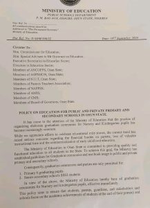 Osun State Government bans graduation parties for Kindergarten and Nursery School pupils, okays graduation parties for Primary 6 and SS 3 classes.