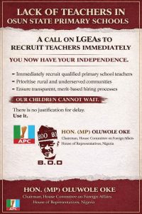 Hon. Oluwole Oke, the House of Representatives member representing Obokun/Oriade Federal Constituency, has given the Osun State Government a seven-day ultimatum to either conclude the long-delayed recruitment of secondary school teachers or refund all application fees collected from applicants.